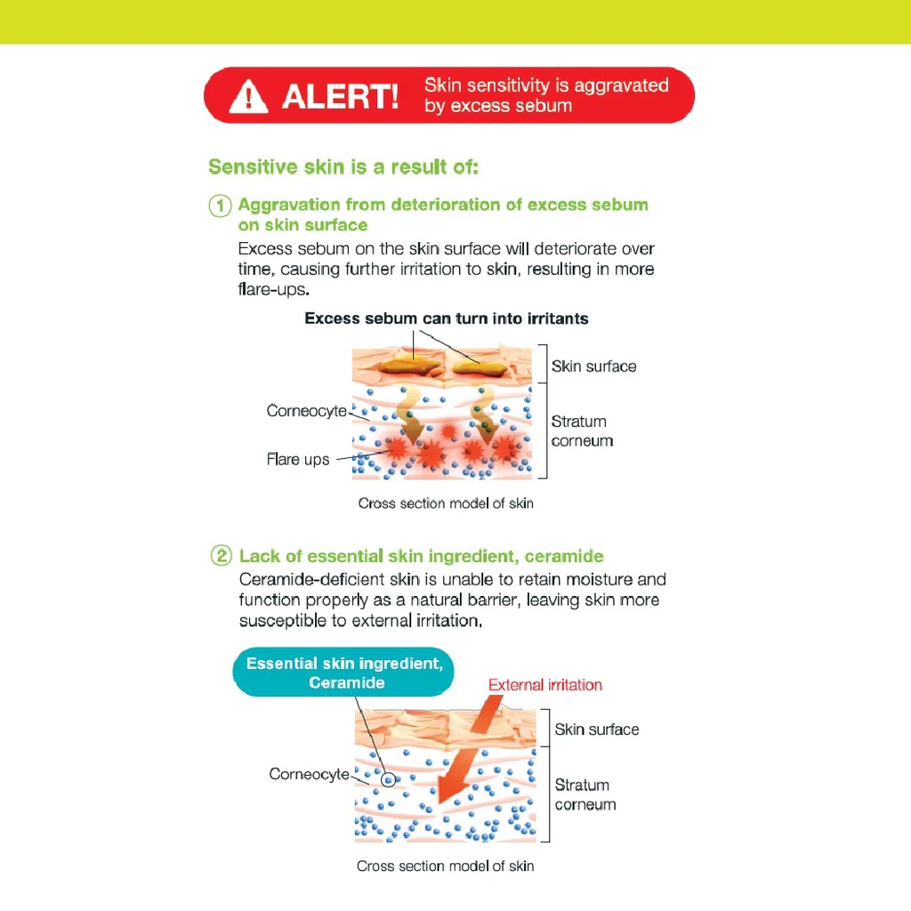 For oily, sensitive skin Controls excess sebum secretion while strengthening skin barrier function for a calmer and more comfortable skin condition throughout the day.